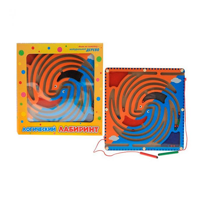 В комплект входит игровое поле с лабиринтом из прорезей с шариками. Сверху и снизу при помощи шнуров прикреплены ручки с магнитными наконечниками.