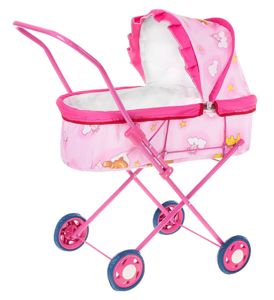 Особенности: коляска-люлька, материал каркаса металл, длина люльки 50 см, высота ручки от пола 61 см, колёса резиновые, диаметром 10 см, козырёк складывается, коляска легко собирается и разбирается