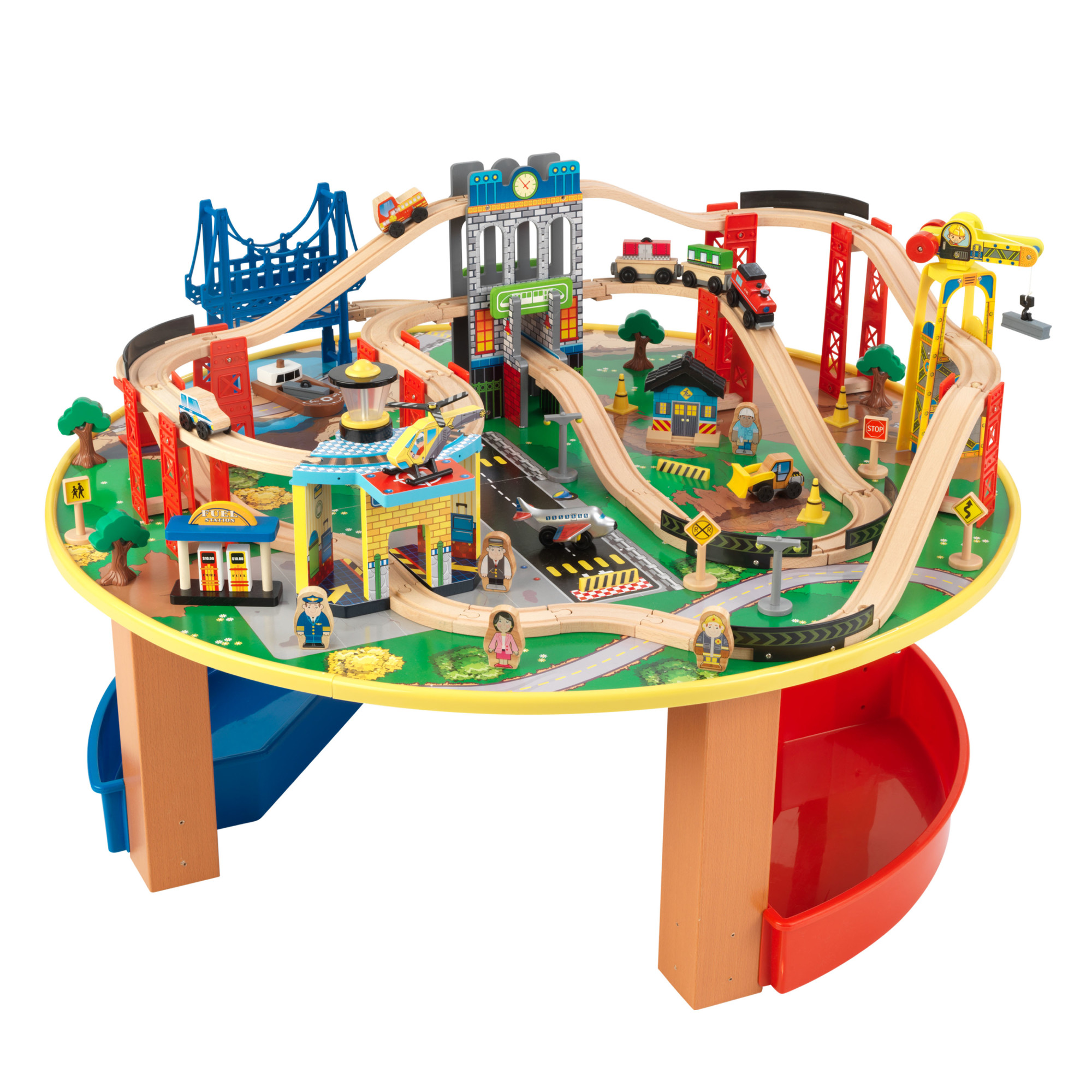 В комплекте: стол; 2 контейнера; элементы для сборки железной дороги; подъемный кран; аэропорт с вертолетом и вертолетной площадкой; самолет со взлетно-посадочной полосой и т.д.