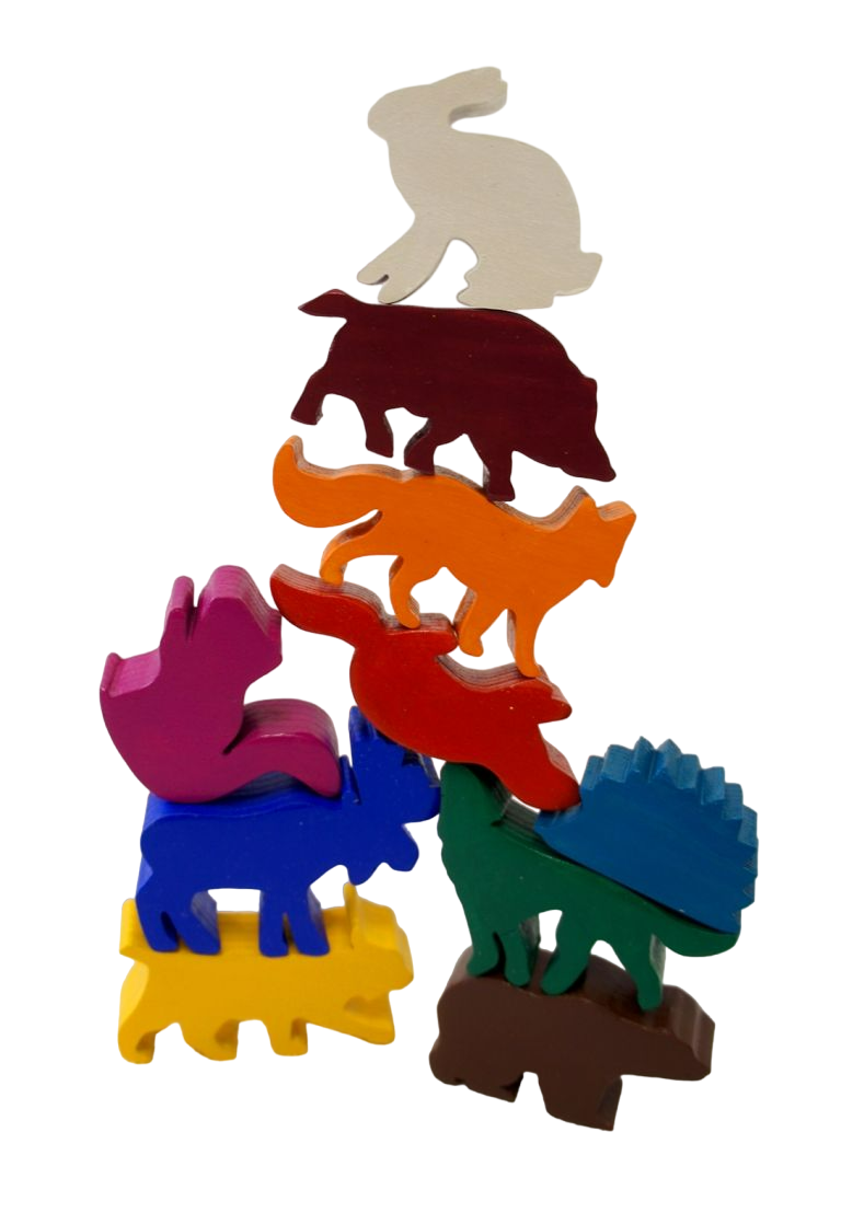 10 фигурок, среди которых заяц, кабан, белка, лось, еж, медведь, волк, рысь, ласка и лиса, найдут применение во множестве игр и занятий. Их можно использовать как героев сказки, для визуализации сюжета, как счетный материал или куклы в театре, но самое интереснее – строить из них башни. Фигурки-балансиры разработаны таким образом, чтобы при должной аккуратности и внимательности, дети могли поставить все фигурки друг на друга, получив «стенку». Такие упражнения развивают мелкую моторику, точность движений, пространственное мышление.