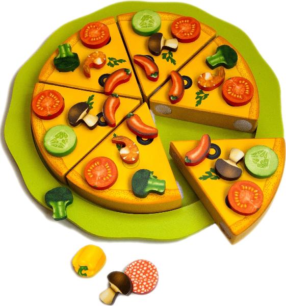 Набор состоит из: 6-ти кусочков пиццы, скрепляющихся с помощью липучек; комплекта элементов для наполнения пиццы (66 штук), которые крепятся на магнитах; ножика, подноса и книги рецептов.