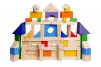 Деревянный конструктор включает 20 деталей разных цветов, которые станут замечательным украшением игрушечного города.