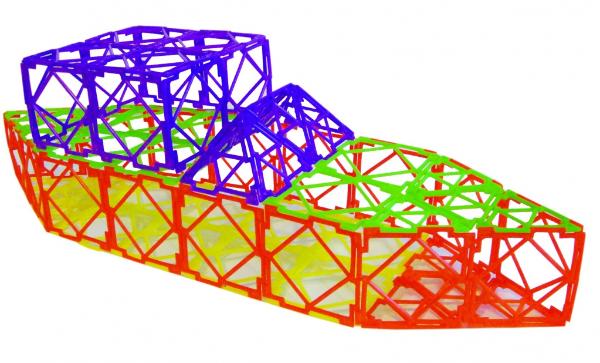 Особенность конструктора - шарнирное соединение деталей и рамочная конструкция. Каждая сторона рамы имеет специальные пазы, тем самым все детали могут соединяться друг с другом и даже поворачиваться на 270 градусов относительно друг друга.