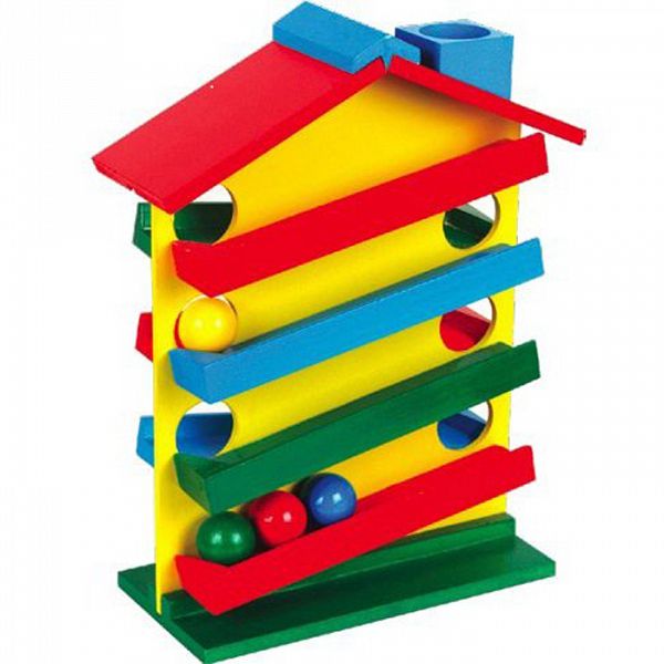 Горки расположены с обеих сторон домика, поэтому шарик то исчезает в отверстие в стене, то вновь появляется уже из другого отверстия.